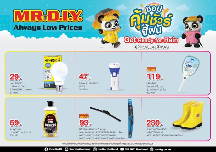 มิสเตอร์. ดี.ไอ.วาย. ได้จัดแคมเปญ “ชอปคุ้มชัวร์ สู้ฝน Get Ready for Rain” เพื่อช่วยให้ครอบครัวไทยเตรียมพร้อมรับมือกับฤดูฝนในปีนี้ โดยคัดสรรสินค้าจำเป็นกว่า 60 รายการ อาทิ สินค้าแนะนำรับหน้าฝน เสื้อกันฝนผู้ใหญ่ ราคา 27 บาท