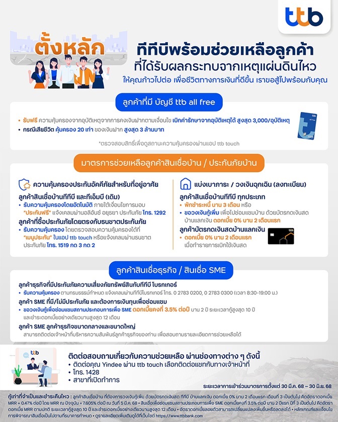 ทีทีบีขอแสดงความเสียใจกับผู้ประสบเหตุการณ์แผ่นดินไหวครั้งใหญ่เมื่อวันที่ 28 มีนาคม 2568 ที่ผ่านมา และมีความห่วงใยลูกค้าทุกกลุ่ม เร่งให้ความช่วยเหลือเพื่อบรรเทาความเดือดร้อน ครอบคลุมทั้งลูกค้าบุคคล ผู้ประกอบการธุรกิจและเอสเอ็มอี ที่อาจประสบปัญหาความเดือดร้อนด้านที่อยู่อาศัย และสถานประกอบการธุรกิจ รวมทั้งเพิ่มสภาพคล่องให้ หวังช่วยให้ทุกคนสามารถกลับมาตั้งหลักและก้าวไปต่อ เพื่อชีวิตทางการเงินที่ดีขึ้น