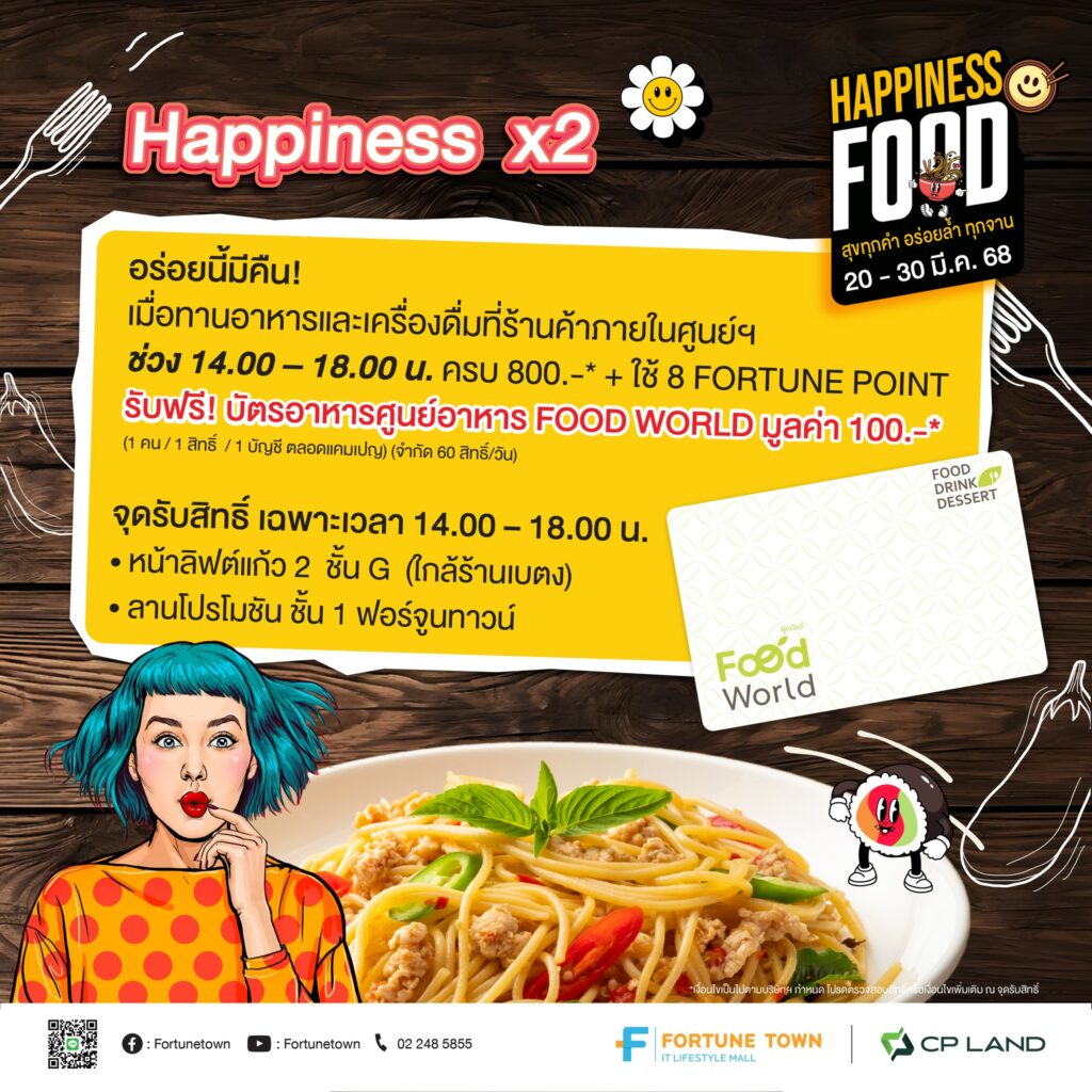 · Happiness X 2: ทานอาหารและเครื่องดื่ม ในศูนย์การค้าฯ ครบ 800 บาท ในช่วงเวลา 14.00-18.00 น. ร่วมกับใช้ 8 Fortune Points แลกรับฟรี! บัตรอาหาร Food World มูลค่า 100 บาท!