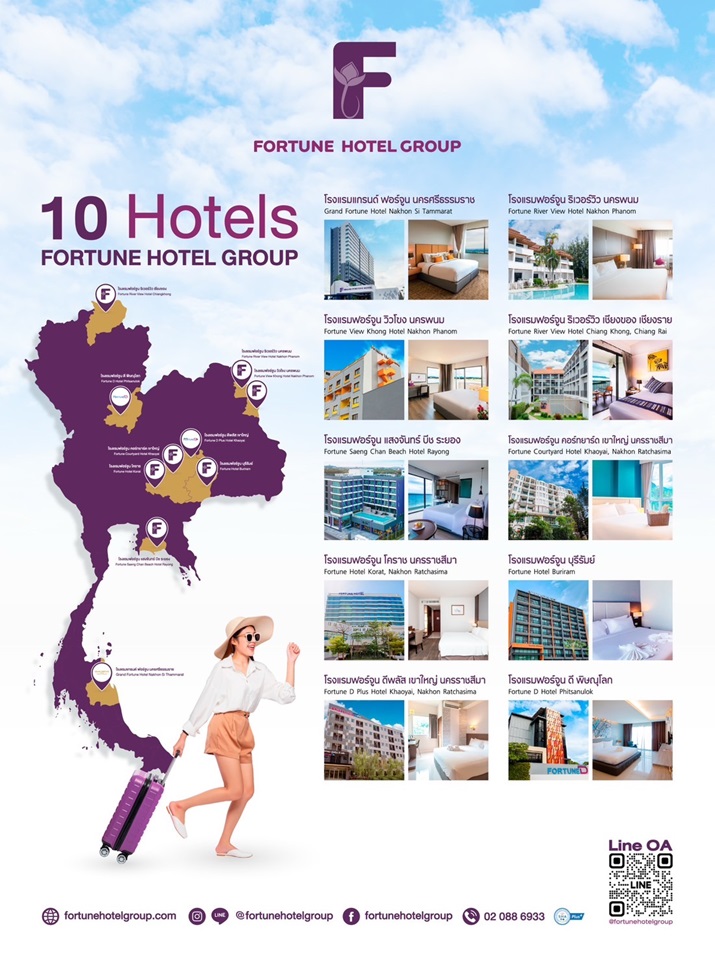 ไม่ว่าจะเป็นโรงแรมใกล้ชิดธรรมชาติที่ เขาใหญ่-นครศรีธรรมราช โรงแรมริมโขงวิวสวย หรือโรงแรมใจกลางเมืองใหญ่อย่าง โคราช บุรีรัมย์ ระยอง ฟอร์จูน โฮเทล กรุ๊ป พร้อมมอบประสบการณ์การพักผ่อนที่สะดวกสบาย และคุ้มค่าในทุกการเดินทาง