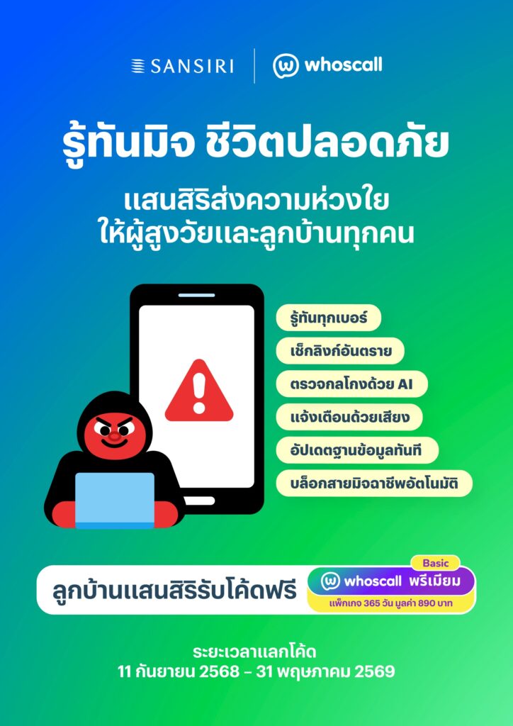 เพื่อรับมือกับความปลอดภัยรอบด้าน แสนสิริ และ Whoscall ได้ร่วมมือกัน มอบโค้ด Whoscall พรีเมียม เบสิก ฟรี 365 วัน (มูลค่า 890 บาท) ให้กับลูกบ้าน โดยลูกบ้านสามารถกดรับสิทธิ์ได้ผ่านแอป Sansiri Home Service ตั้งแต่ 11 ก.ย 68 ถึง 31 พ.ค.69 หรือจนกว่าโค้ดจะหมด จุดเด่นของ Whoscall พรีเมียม เบสิก คือ บล็อกสายมิจฉาชีพ และเบอร์ที่น่าสงสัยได้อัตโนมัติ,
