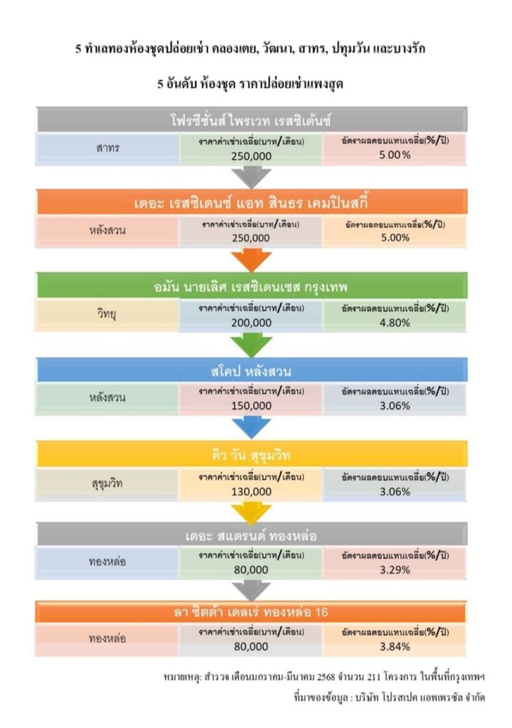 และอันดับ 5 คือ โครงการ เดอะ สแตรนด์ ทองหล่อ พัฒนาโดยบริษัท วันพ้อยซิกซ์ ดีเวลลอปเมนท์ จำกัด อยู่ในซอยสุขุมวิท 55 และ โครงการ ลา ซิตต้า เดลเร่ ทองหล่อ 16 พัฒนาโดยบริษัท บริษัท หงษ์นคร พร็อพเพอร์ตี้ จำกัด ในซอยสุขุมวิท 24 ทั้งสองโครงการมีอัตราค่าเช่าเฉลี่ยที่ 80,000 บาทต่อเดือน คิดเป็นอัตราผลตอบแทนจากการลงทุนโดยเฉลี่ยที่ 3.29% และ 3.84% ตามลำดับ