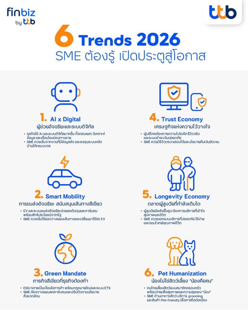 ปี 2026 คือจุดเปลี่ยนสำคัญที่ SME ไทยต้อง “กล้าปรับ” และ “กล้าลงมือ” เพื่อคว้าโอกาสในโลกธุรกิจยุคใหม่ที่ฉลาด เขียว และเข้าใจมนุษย์มากขึ้น ทีทีบีพร้อมสนับสนุนด้วยโซลูชันที่ตรงใจและเข้าใจถึงความต้องการของธุรกิจยุคใหม่ ที่มุ่งหน้าสู่ธุรกิจสีเขียว