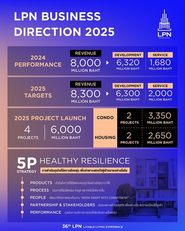 นางสาวดารณี ฉัตรพิริยะพันธ์ ประธานเจ้าหน้าที่บริหาร เปิดเผยถึงแผนการดำเนินงานของบริษัทในปี 2568 ว่า หากดูจากสถานการณ์ของเศรษฐกิจปัจจุบัน จะเห็นชัดว่าเป็นปีที่ท้าทายการทำงานของผู้ประกอบการอสังหาริมทรัพย์ เนื่องจากกำลังซื้อที่อยู่อาศัยภายในประเทศชะลอตัว จากภาระหนี้ครัวเรือนที่ยังสูงอยู่เกิน 90% ต่อผลิตภัณฑ์มวลรวมภายในประเทศ (Gross Domestic Products : GDP) และสถาบันการเงินยังคงเข้มงวดในการพิจารณาสินเชื่อเพื่อที่อยู่อาศัยจากความสามารถในการชำระคืนหนี้ของผู้ซื้อลดลงต่อเนื่อง ในขณะเดียวกัน พฤติกรรมของผู้ซื้อที่อยู่อาศัยในปัจจุบันเปลี่ยนแปลงไป จากผลการสำรวจของหลายสำนักวิจัยพบว่า ปัจจุบันคนรุ่นใหม่เน้นการเช่ามากกว่าการซื้อเนื่องจากรายได้ไม่เพียงพอต่อการซื้อที่อยู่อาศัย โดยกระทบมาจากทั้งราคาที่ดิน ราคาวัสดุก่อสร้าง ที่ปรับตัวสูงขึ้น ทำให้ผู้ประกอบการอสังหาริมทรัพย์ต้องปรับกลยุทธ์ในการทำธุรกิจ โดยปีนี้ LPN จึงต้องปรับกลยุทธ์การทำธุรกิจในปี 2568 สู่แนวคิด “Healthy Resilience” โดยให้ความสำคัญกับการดำเนินธุรกิจที่ต้องมีความยืดหยุ่นขึ้น เพื่อนำพาองค์กรไปสู่เป้าหมาย ซึ่งประกอบด้วยแกนหลัก “5P” ได้แก่