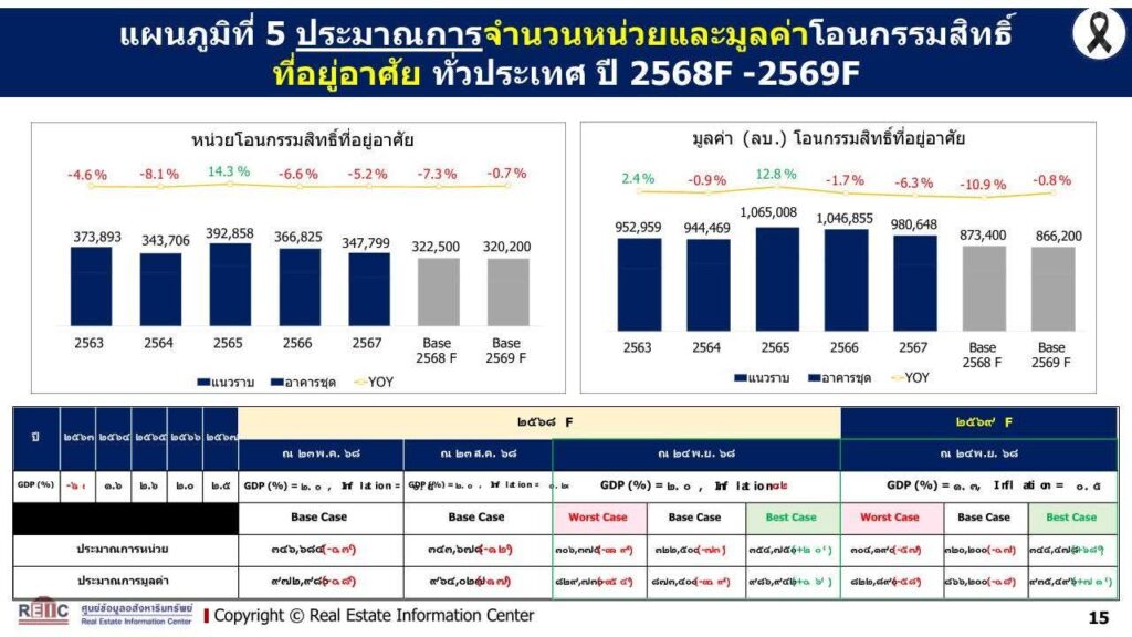 อย่างไรก็ตาม ทั้งปี 2568 การโอนกรรมสิทธิ์ที่อยู่อาศัยทั่วประเทศยังคงติดลบ แต่เป็นการติดลบที่ลดลงกว่าที่เคยคาดการณ์ โดยจะมีการโอนกรรมสิทธิ์ที่อยู่อาศัยทั่วประเทศจำนวน 322,500 หน่วย ลดลง -7.3% เมื่อเทียบกับปี 2567 และมีมูลค่าการโอนประมาณ 873,400 ล้านบาท ลดลง -10.9% เมื่อเทียบกับปี 2567 และคาดว่าปี 2569 สถานการณ์จะปรับตัวดีขึ้นต่อเนื่องโดยจะมีการโอนกรรมสิทธิ์ที่อยู่อาศัยทั่วประเทศจำนวน 320,200 หน่วย ลดลงเพียง -0.7% เมื่อเทียบกับปี 2568 และมีมูลค่าการโอนประมาณ 866,200 ล้านบาท ลดลง -0.8% เมื่อเทียบกับปี 2568 ขณะที่สินเชื่อ