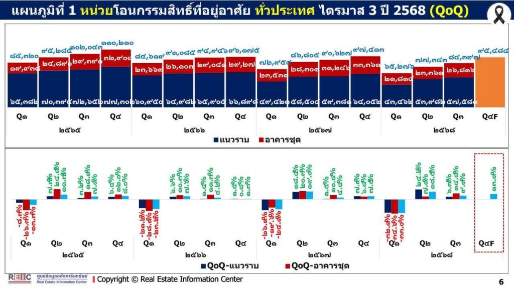 เป็นปัจจัยบวกต่อภาคอสังหาริมทรัพย์ และเศรษฐกิจโดยรวม ทำให้ยอดการโอนกรรมสิทธิ์ที่อยู่อาศัยทั่วประเทศไตรมาส 4 ปี 2568 ฟื้นตัวขึ้น โดยจะมียอดการโอนจำนวน 95,484 หน่วย เพิ่มขึ้น 13.1% จากไตรมาส 3 (QoQ) ที่มีจำนวน 84,397 หน่วย และมีมูลค่าจำนวน 255,632 ล้านบาท เพิ่มขึ้น 13.0% จากไตรมาส 3 (QoQ) ที่มีจำนวน 226,166 ล้านบาท ส่วนสินเชื่อที่อยู่อาศัยบุคคลปล่อยใหม่ ทั่วประเทศ ไตรมาส 4 ปี 2568 คาดการณ์มีมูลค่าประมาณ 160,775 ล้านบาท เพิ่มขึ้น 9.5% จากไตรมาส 3 (QoQ) ที่มีมูลค่า 146,834 ล้านบาท