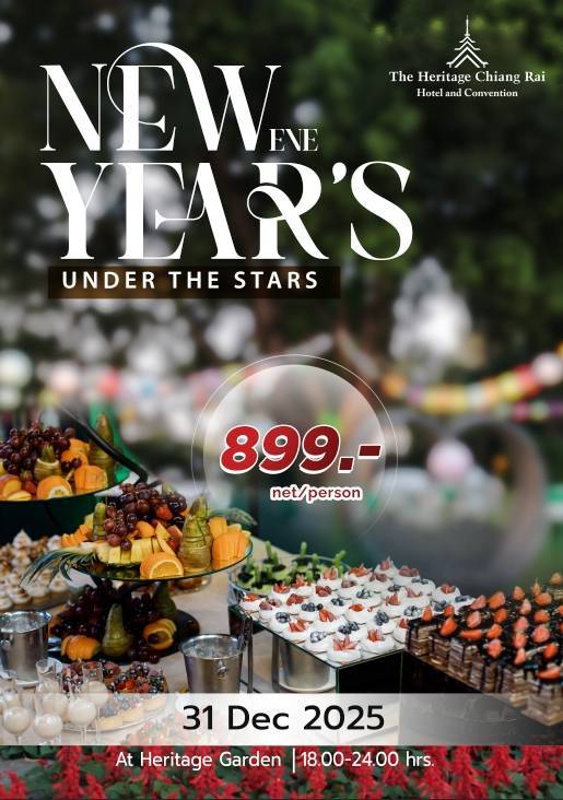 โรงแรม The Heritage Chiang Rai Hotel & Convention ขอเชิญร่วมเฉลิมฉลองคืนส่งท้ายปีเก่า ต้อนรับปีใหม่ 2569 กับกิจกรรม “New Year’s Eve Under the Stars” ดินเนอร์บุฟเฟต์ส่งท้ายปีท่ามกลางบรรยากาศสวนยามค่ำคืน ณ Heritage Garden ในวันพุธที่ 31 ธันวาคม 2568 ตั้งแต่เวลา 18.00 – 24.00 น.